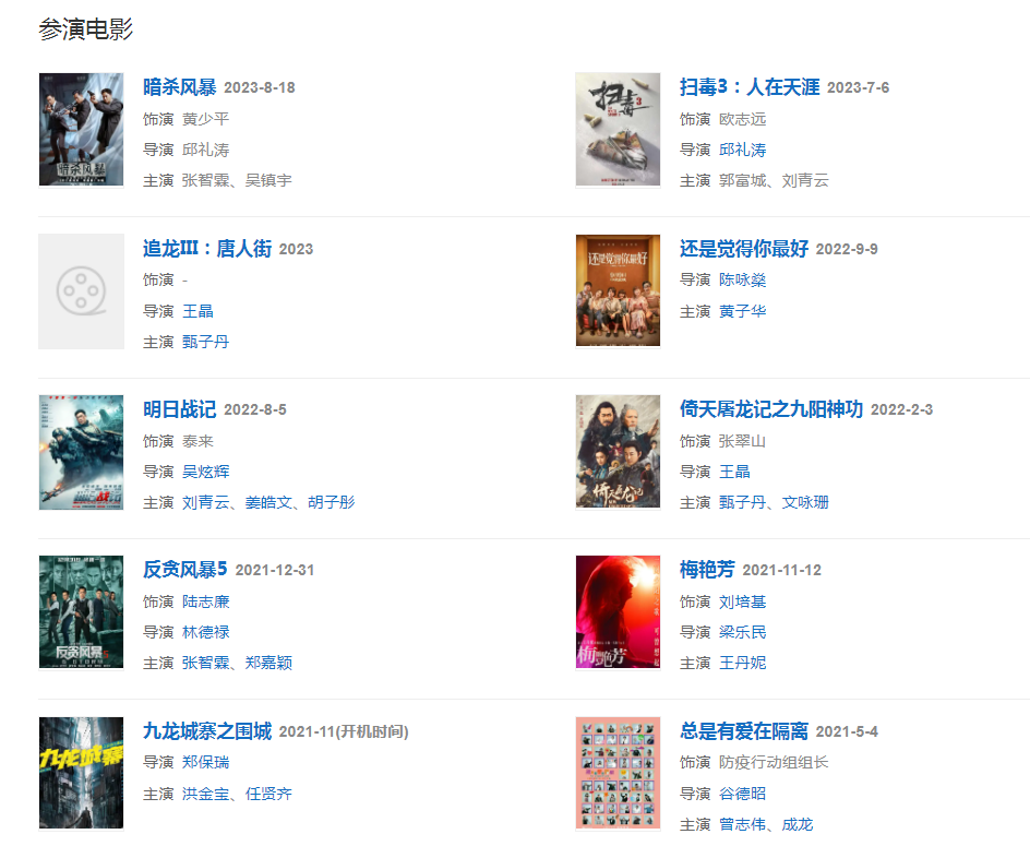 2023年7月6日,由邱禮濤執(zhí)導(dǎo)的電影《掃毒3:人在天涯》上映,片中飾演歐志遠(yuǎn);