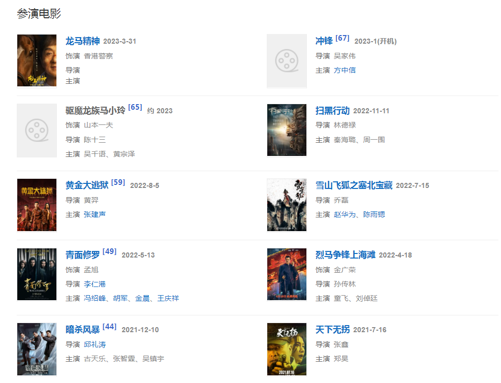 2023年1月11日,參演的電影《天龍八部之喬峰傳》發(fā)布“快意恩仇”版預(yù)告,定檔大年三十(1月21日)上線。