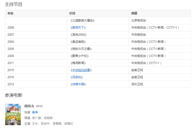 2006年,參加《開心辭典》魅力新搭檔的評選活動(dòng),獲得比賽前三名;同年,擔(dān)任中央電視臺(tái)新聞資訊節(jié)目《朝聞天下》的主持人。
